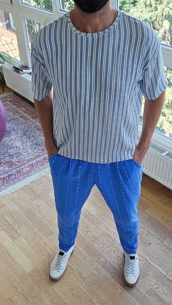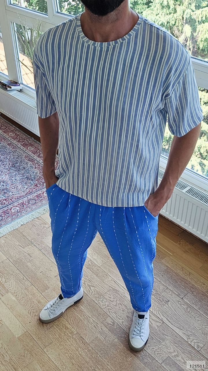 Футболка вільного крою з округлим вирізом + штани на резинці з боковими кишенями.