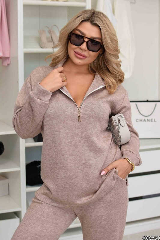 Костюм-двійка : кофта на молнії на грудях , , по низу нашивка , рукава на манжеті ; штани до низу вільні , з боків кишені , талія на резинці.