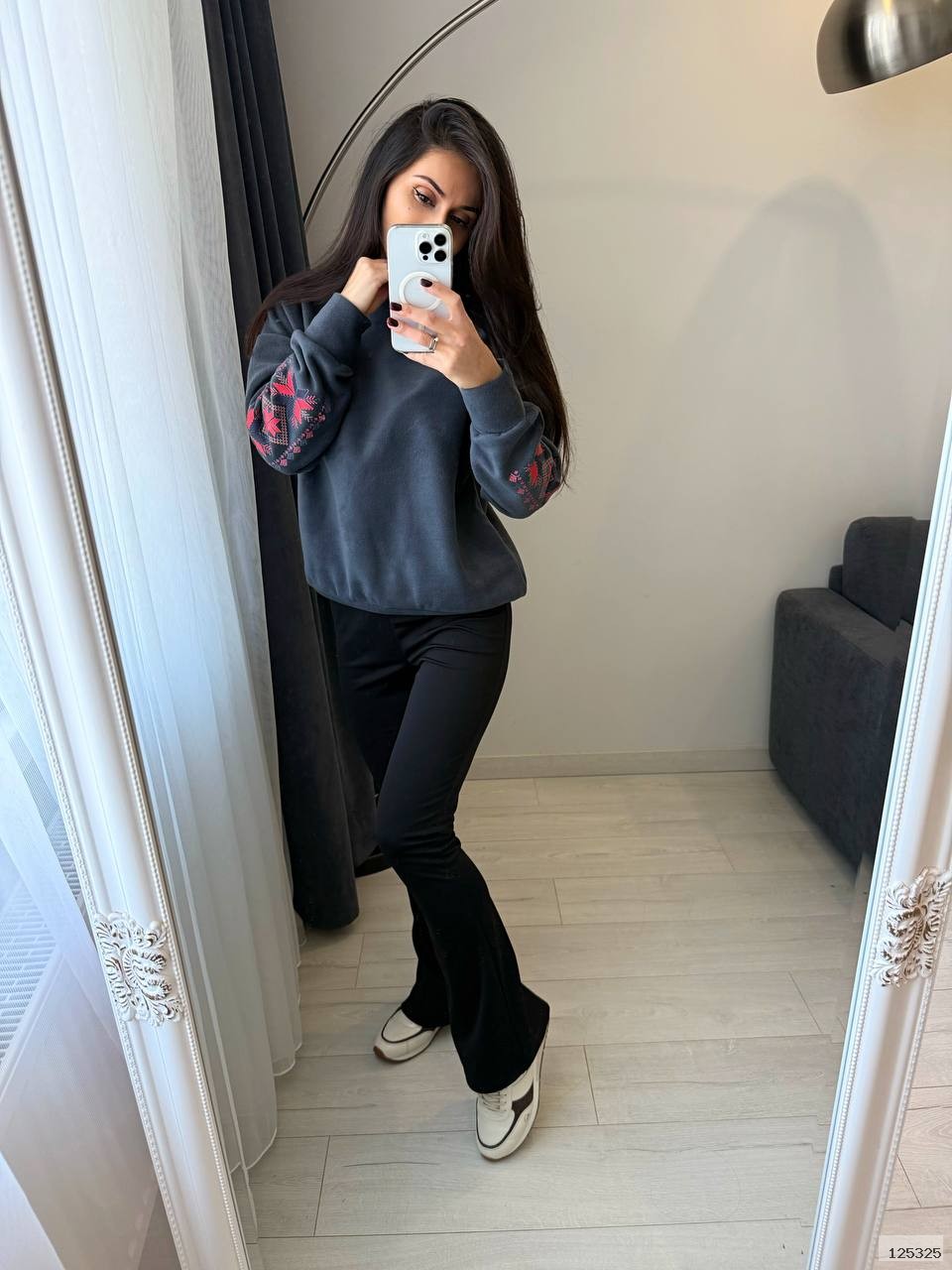 Костюм (кофта+лосини теплі). М’який трикотаж із начосом дарує затишок і тепло, а продуманий крій забезпечує зручність у кожному русі. Кофта з оригінальною вишивкою на рукаві додає образу родзинки, а лосини з високою посадкою красиво підкреслюють фігуру.
