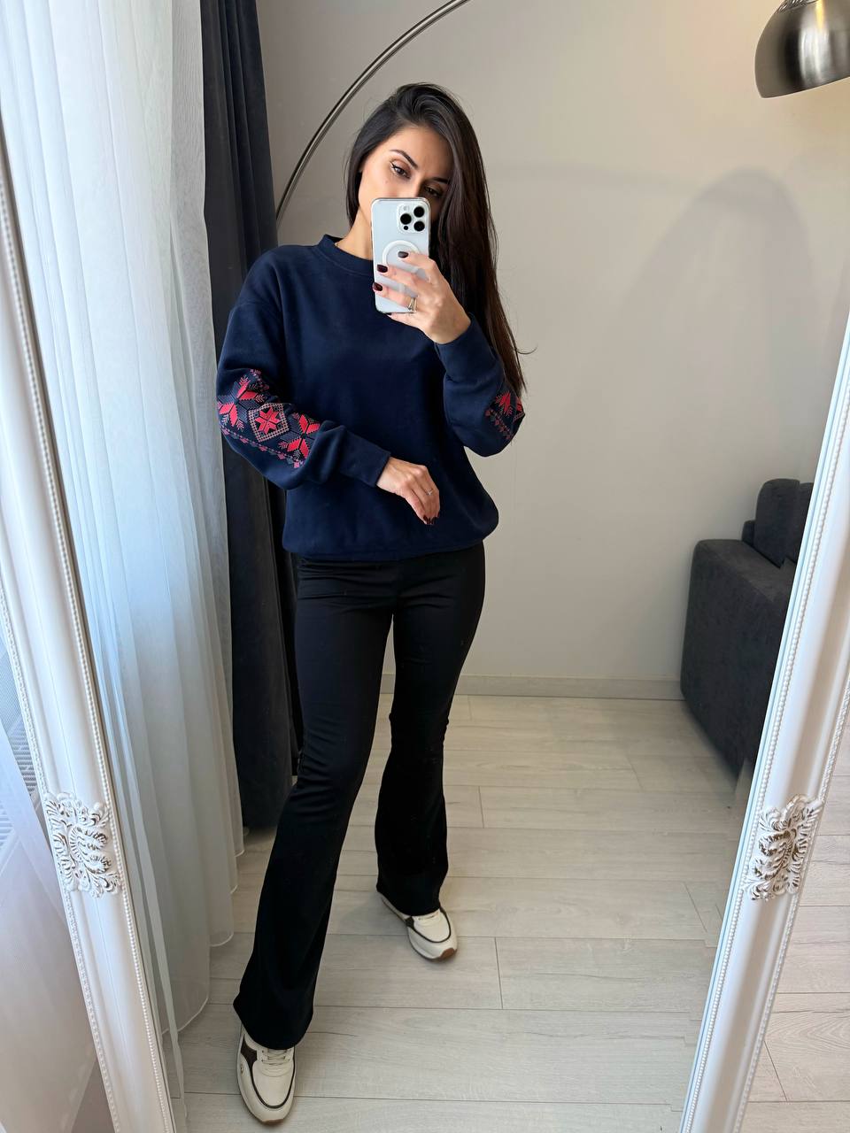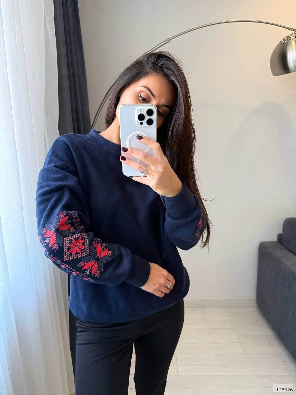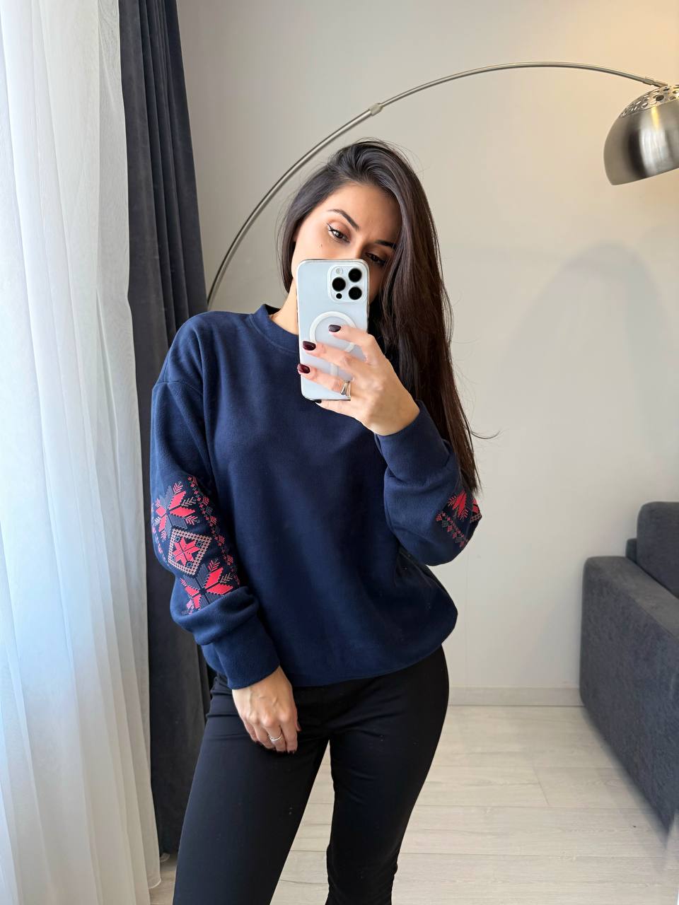 Костюм (кофта+лосини теплі). М’який трикотаж із начосом дарує затишок і тепло, а продуманий крій забезпечує зручність у кожному русі. Кофта з оригінальною вишивкою на рукаві додає образу родзинки, а лосини з високою посадкою красиво підкреслюють фігуру.