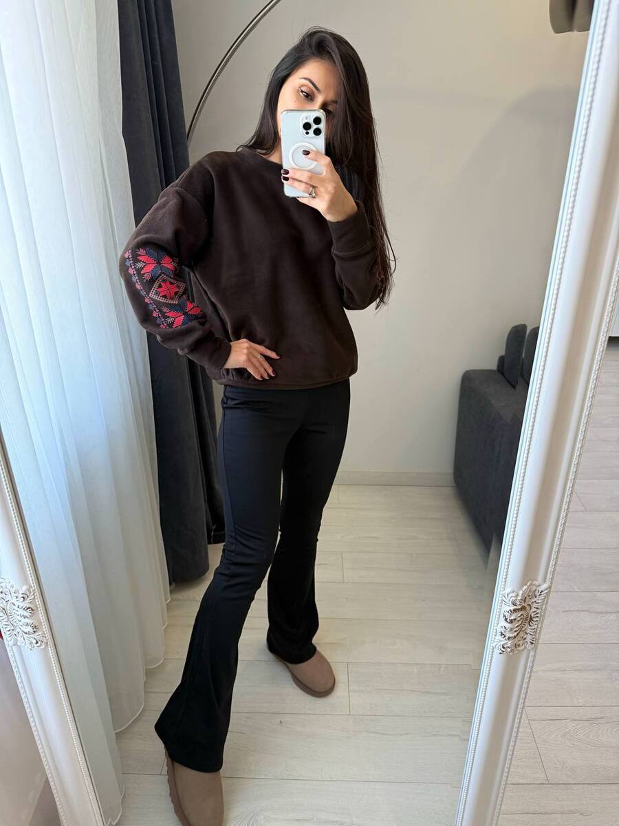 Костюм (кофта+лосини теплі). М’який трикотаж із начосом дарує затишок і тепло, а продуманий крій забезпечує зручність у кожному русі. Кофта з оригінальною вишивкою на рукаві додає образу родзинки, а лосини з високою посадкою красиво підкреслюють фігуру.