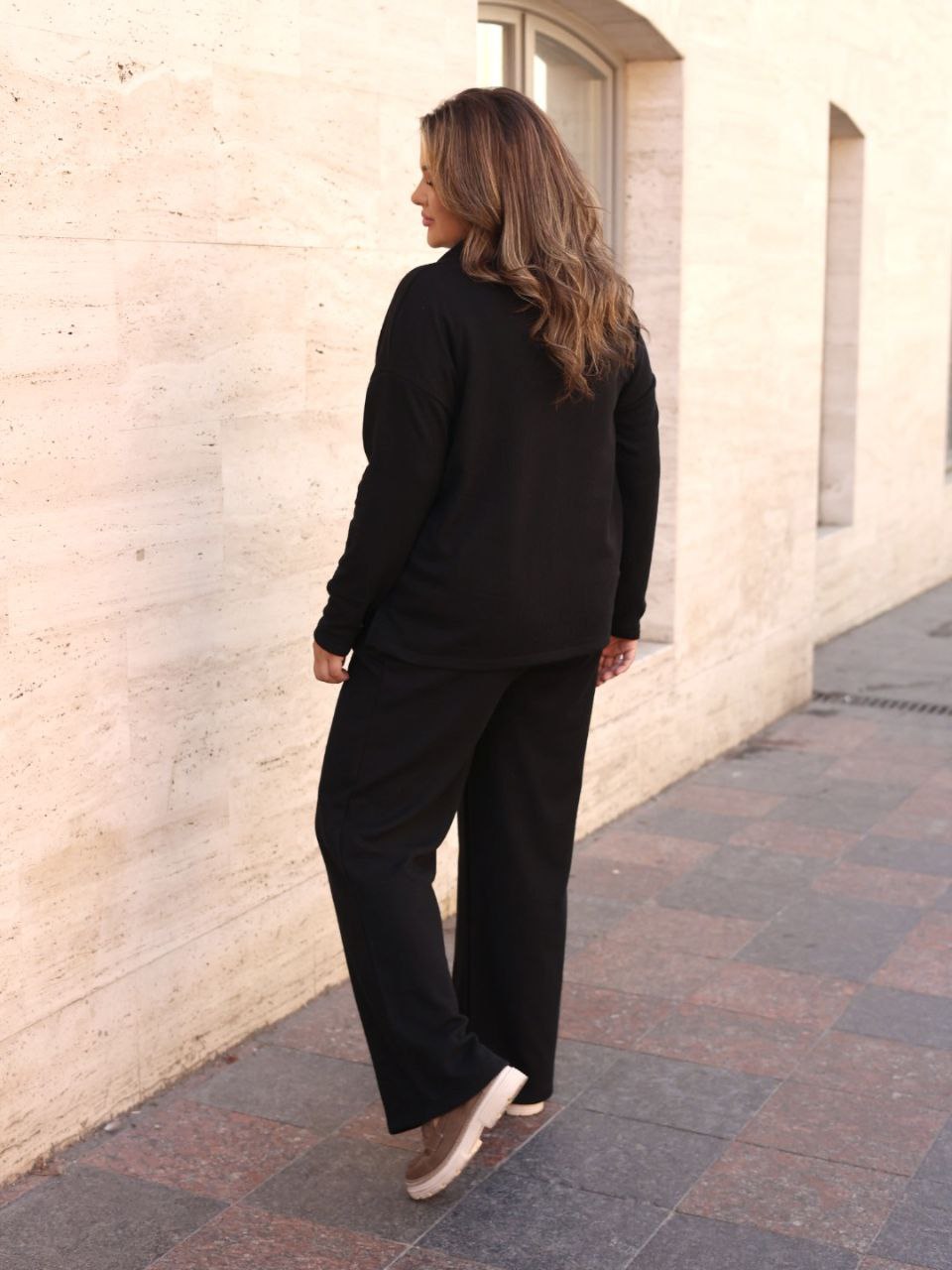 Стильний тепленький костюм. Кофта з v-образним вирізом та відкладним коміром. Вільні брюки,пояс на різинці,з боків кишені.