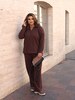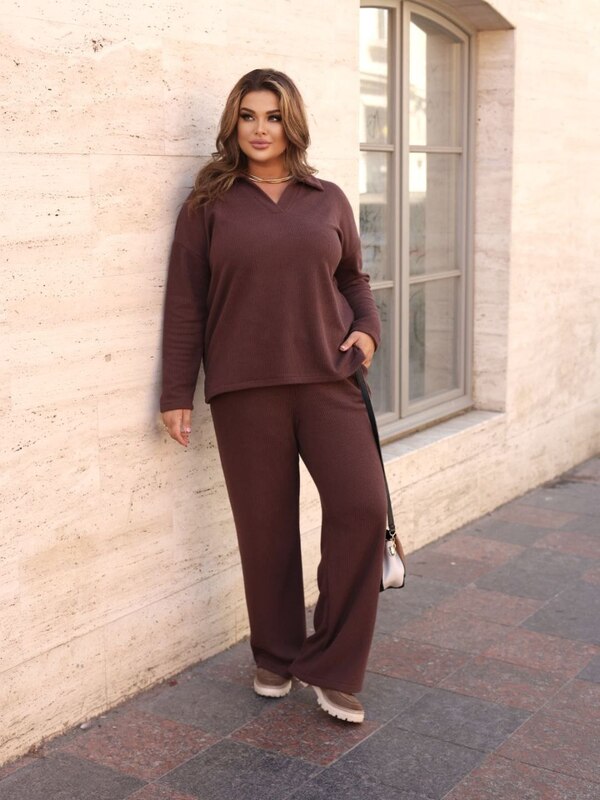 Стильний тепленький костюм. Кофта з v-образним вирізом та відкладним коміром. Вільні брюки,пояс на різинці,з боків кишені.