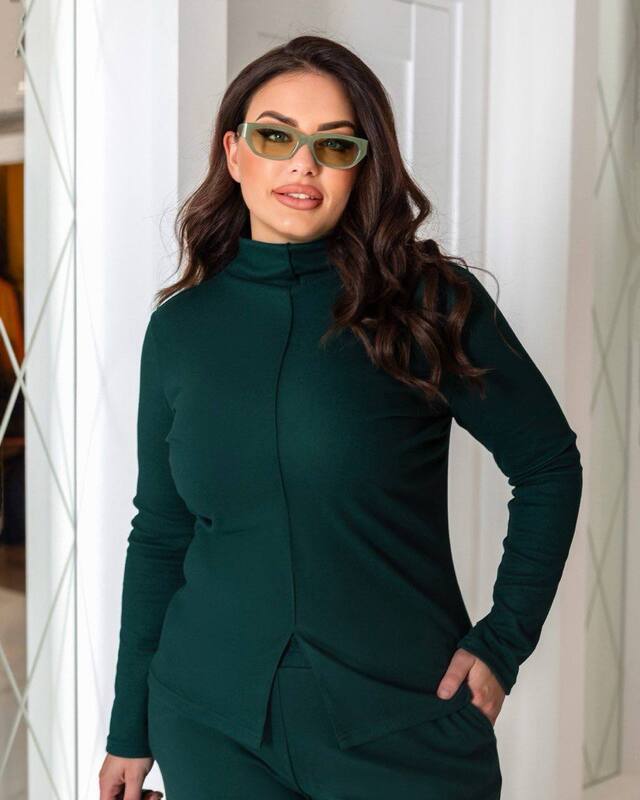Кофта з високою горловиною,на груді декоративні складки,перед з відстрочкою по середині,а також розрізом.