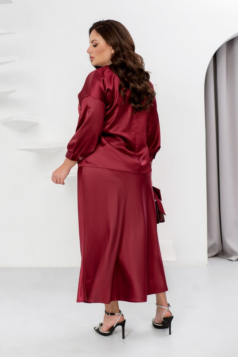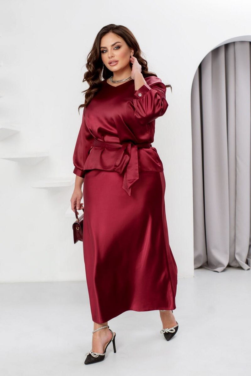Елегантний святковий костюм зі спідницею, створений із розкішного костюмного шовку, стане вашим ідеальним образом для новорічних свят. Він поєднує витонченість і комфорт, роблячи вас зіркою будь-якої святкової події. Блуза з V-подібним вирізом створює акцент на зоні декольте, додаючи образу жіночності. Спущена лінія плечей та рукави довжиною 3/4 з манжетами на ґудзиках забезпечують стильний вигляд і зручність. Довга спідниця на резинці комфортно сідає по фігурі, а текстильний пояс, що входить до комплекту, дозволяє підкреслити талію та додає завершеності образу.