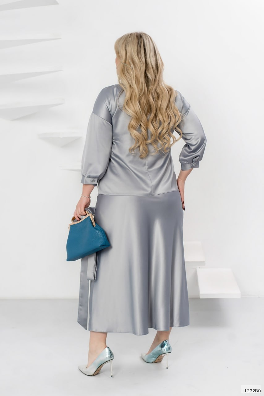 Елегантний святковий костюм зі спідницею, створений із розкішного костюмного шовку, стане вашим ідеальним образом для новорічних свят. Він поєднує витонченість і комфорт, роблячи вас зіркою будь-якої святкової події. Блуза з V-подібним вирізом створює акцент на зоні декольте, додаючи образу жіночності. Спущена лінія плечей та рукави довжиною 3/4 з манжетами на ґудзиках забезпечують стильний вигляд і зручність. Довга спідниця на резинці комфортно сідає по фігурі, а текстильний пояс, що входить до комплекту, дозволяє підкреслити талію та додає завершеності образу.