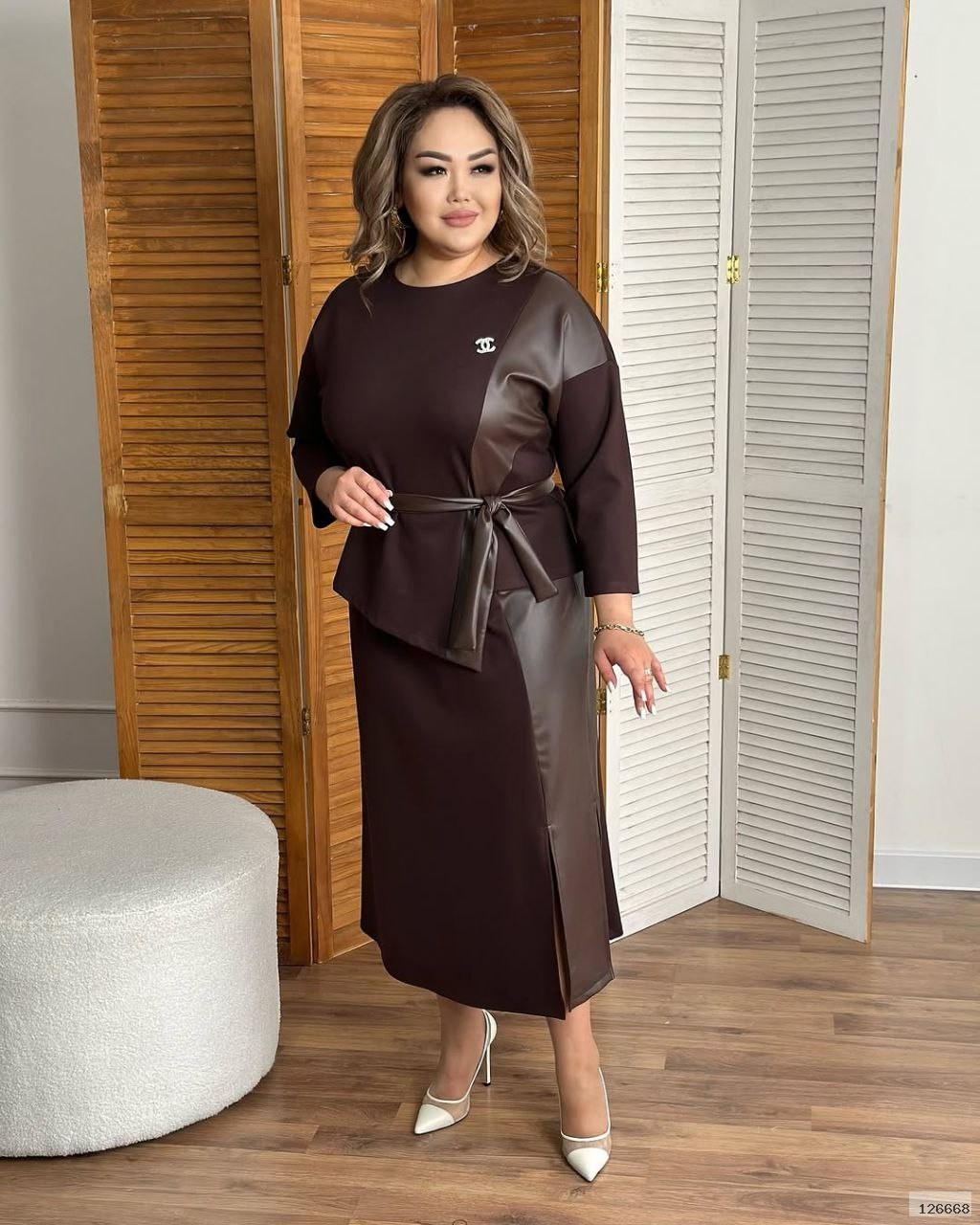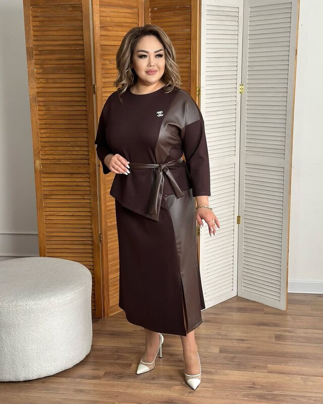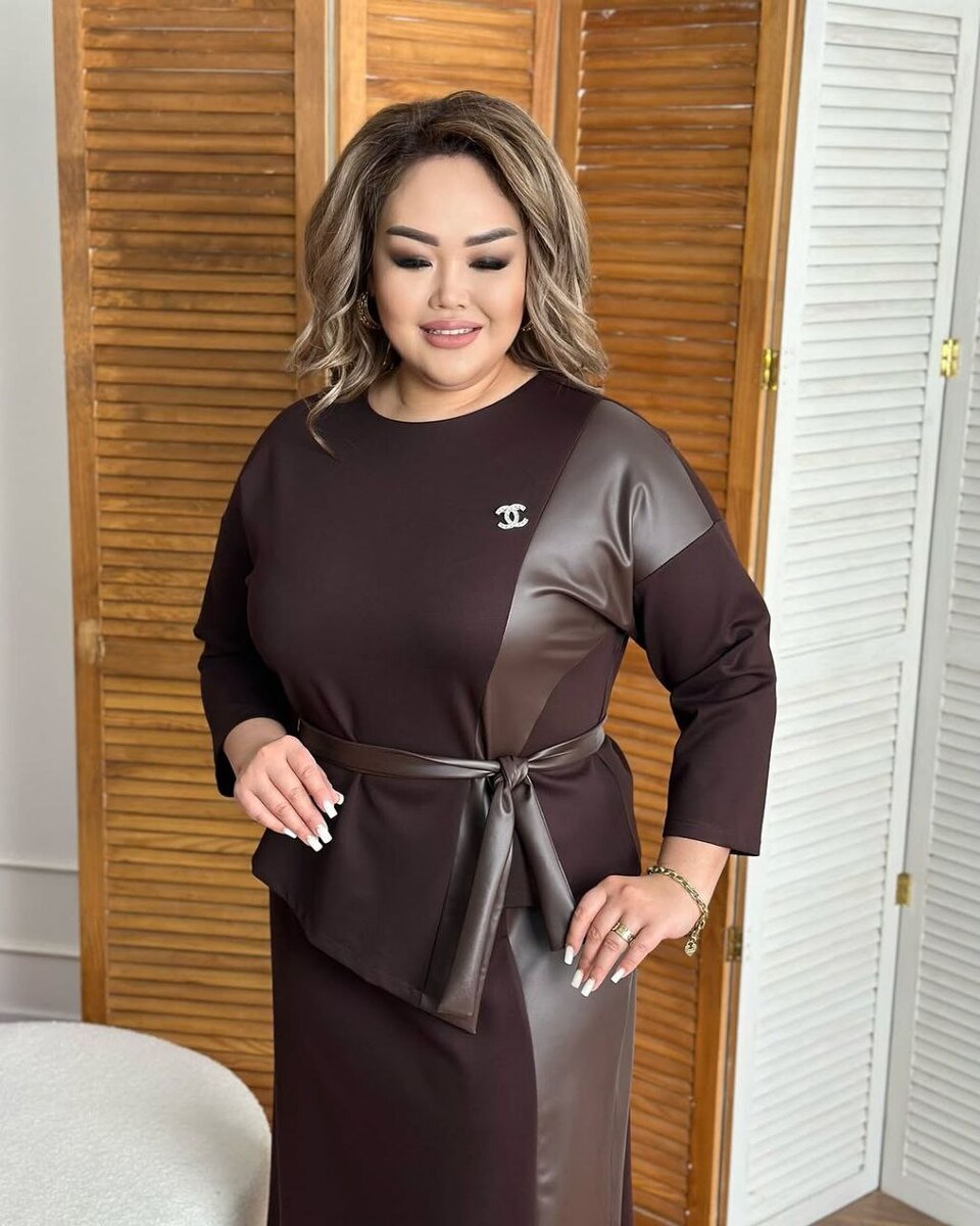 Комбінований костюм двійка спідниця + кофтинка. Спідниця має пояс на резинці. Брошка в комплекті