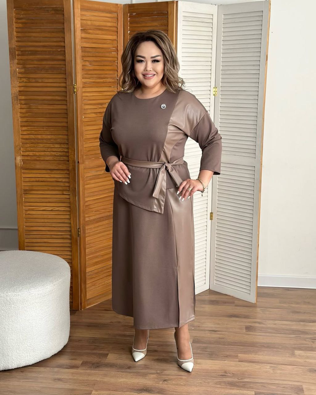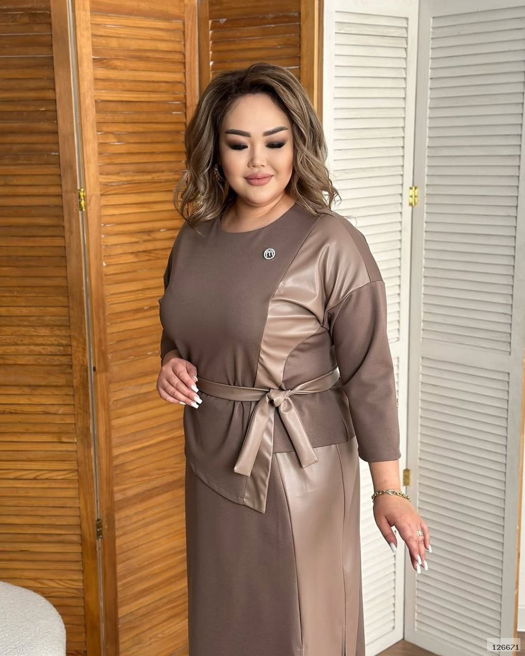 Комбінований костюм двійка спідниця + кофтинка. Спідниця має пояс на резинці. Брошка в комплекті