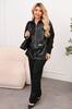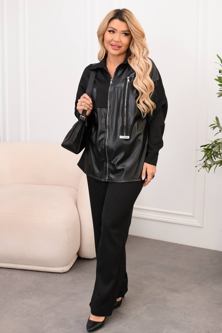 Шикарний костюм-двійка виконаний з крепкостюмки та якісної екошкіри. На грудях декоративна молнія та з іншої сторони робоча кишеня. Кофта на молнії, штани на резинці