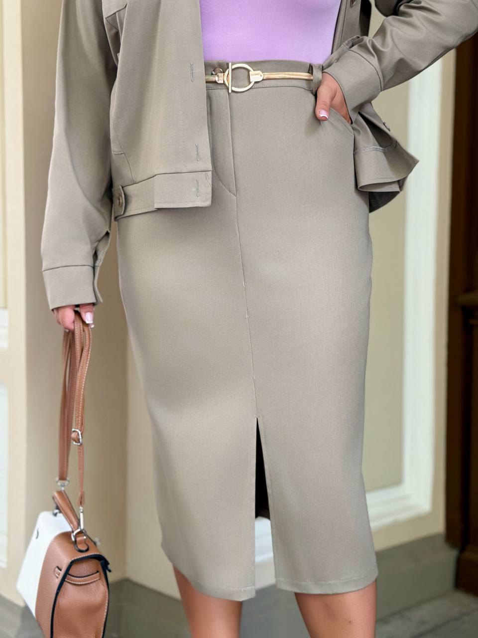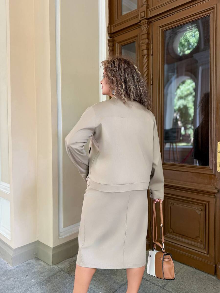 Сттильний костюм двійка, який складається зі спідниці олівець і бомбера.