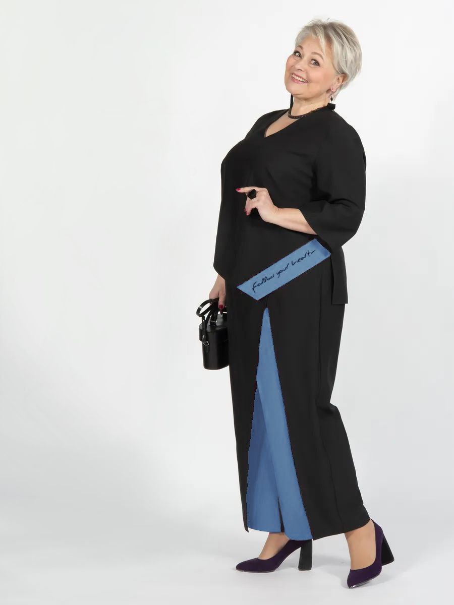 Штани з двоколірним ефектом та оригінальним кроєм, візуально робить стрункішою. Еластичний пояс на талії зручно фіксує посадку.