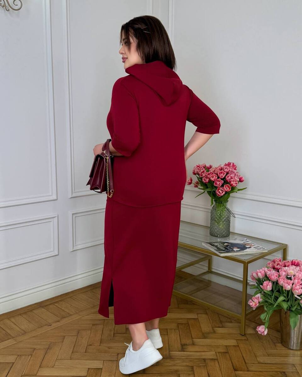 Стильний та комфортний костюм із трикотажу двонитка — ідеальний вибір для повсякденного образу. Комплект складається з подовженої спідниці та зручної кофти з коротким рукавом і капюшоном.