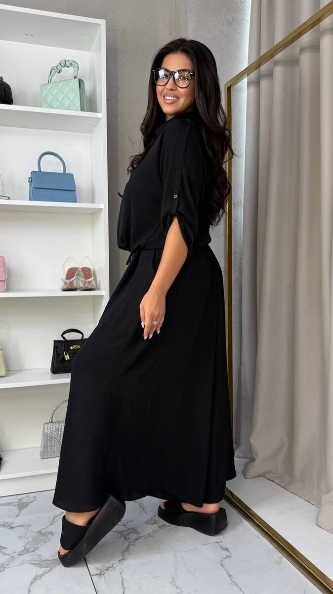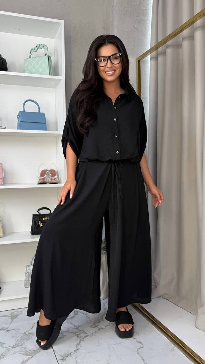 КОСТЮМ сорочка зі спідницею-брюки модний тренд сезону додає жіночності та елегантності образу. Вільний крій та висока талія частково на гумці. Косі кишені в бічних швах. Сорочка зі спущеним плечем довжина рукава 7/8 , сорочка вільного крою з затяжкою по переду.