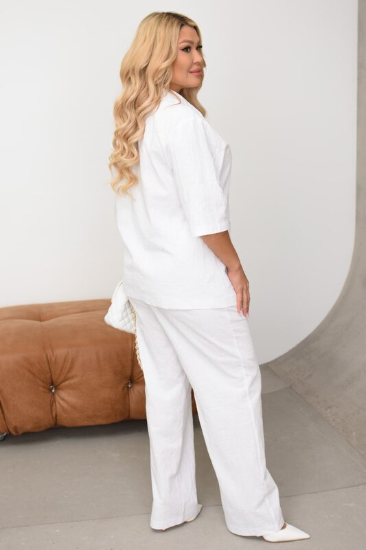 Стильний брючний костюм із легкого жатого льону – ідеальний вибір на весну та літо. Прямий піджак із відкритим вирізом додає елегантності, а штани на резинці дарують комфорт у щоденному носінні.
