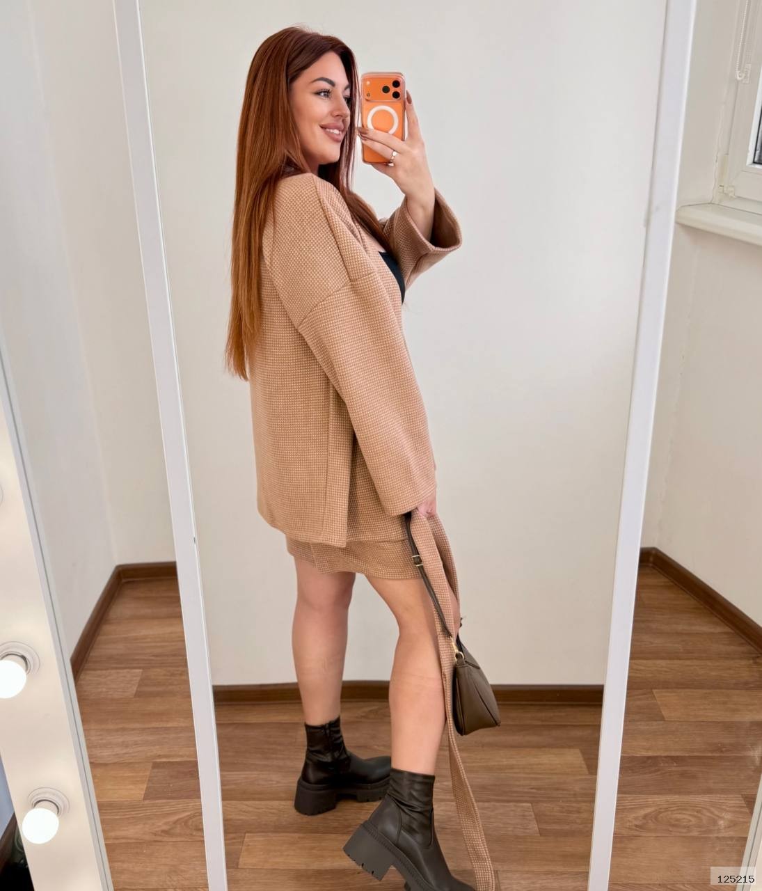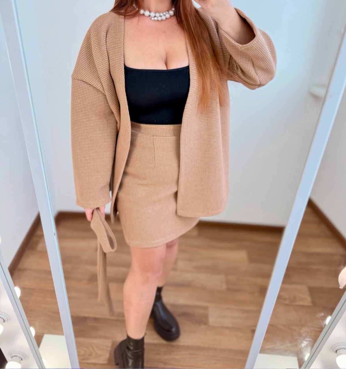 Ніжний, м’який кашемір дарує відчуття тепла та затишку, а продуманий фасон додає жіночності й вишуканості. Комплект складається зі спідниці та кардигана вільного крою, які можна носити разом або комбінувати з іншими речами гардероба.