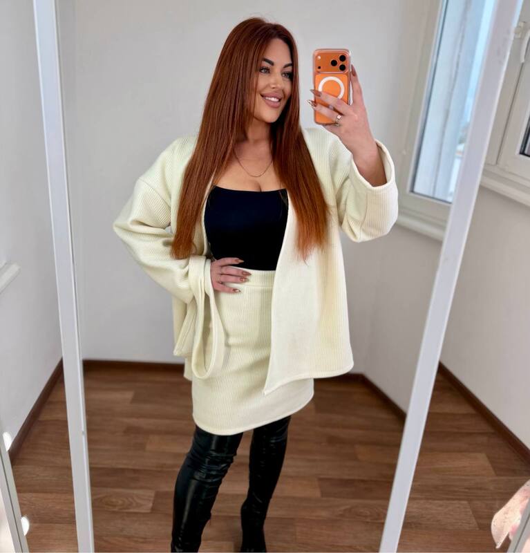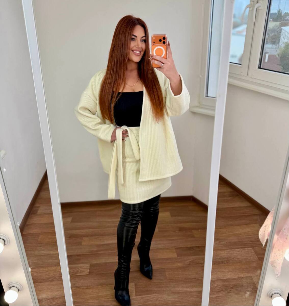 Ніжний, м’який кашемір дарує відчуття тепла та затишку, а продуманий фасон додає жіночності й вишуканості. Комплект складається зі спідниці та кардигана вільного крою, які можна носити разом або комбінувати з іншими речами гардероба.