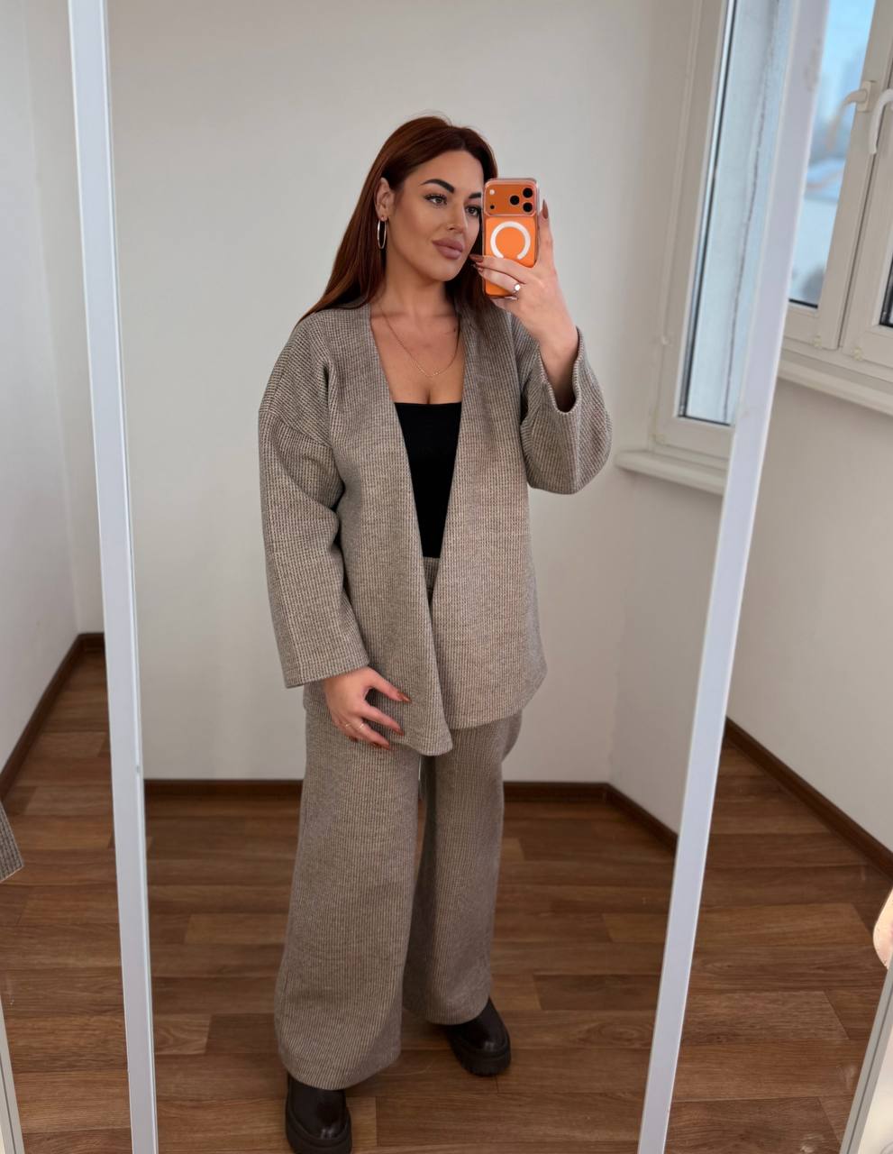 Ніжний, м’який кашемір дарує відчуття тепла та затишку, а продуманий фасон додає жіночності й вишуканості. Комплект складається зі штанів та кардигана вільного крою, які можна носити разом або комбінувати з іншими речами гардероба.