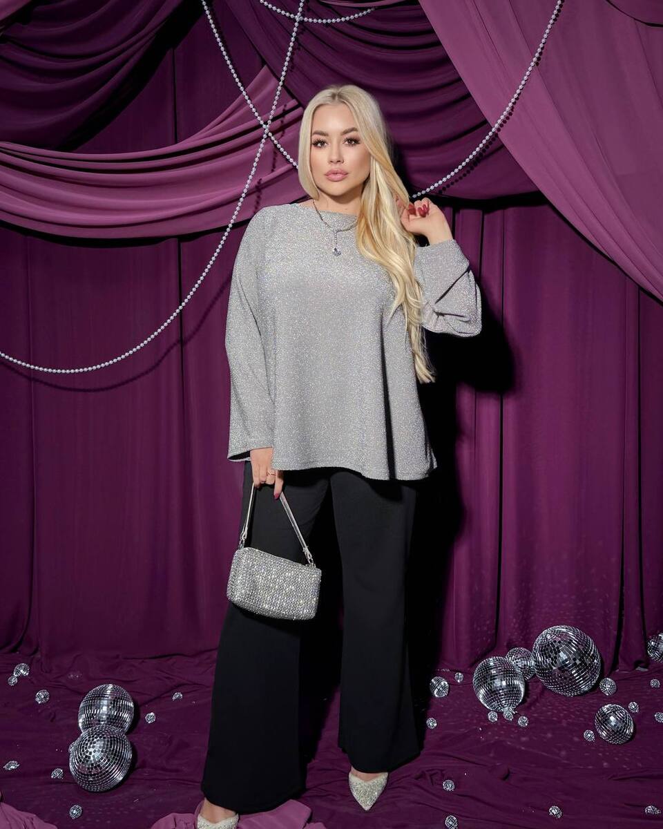 Верх — кофта , яка красиво сяє та додає образу елегантності.