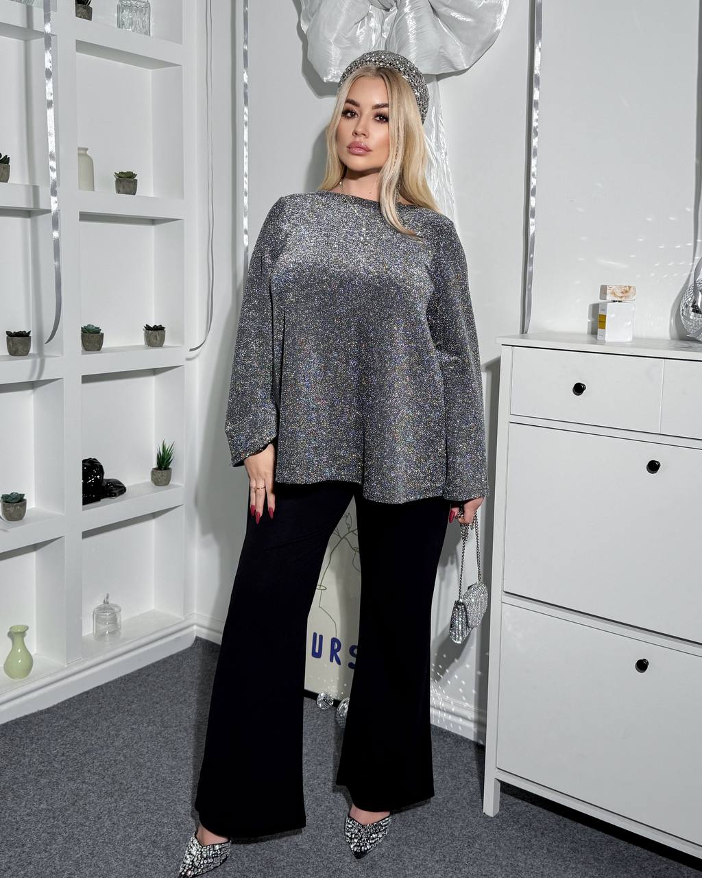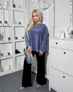Верх — кофта , яка красиво сяє та додає образу елегантності.