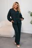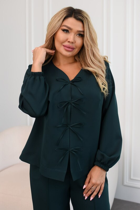 Стильний брючний костюм, який однаково доречний і в офісі, і на особливих подіях. Жакет вільного крою з декоративними застібками-бантиками додає образу елегантності, під верхнім бантом — робочий гудзик. Штани із середньою посадкою та еластичною резинкою ззаду на поясі дарують комфорт щодня.