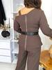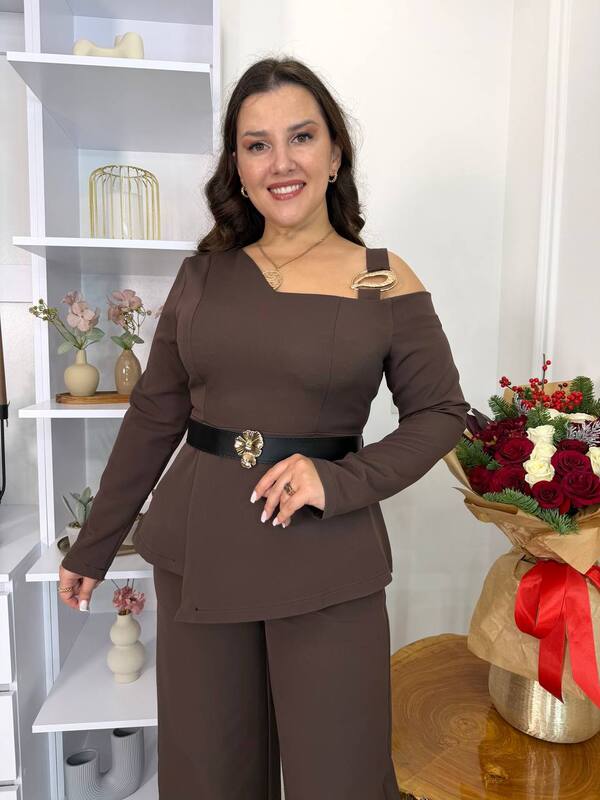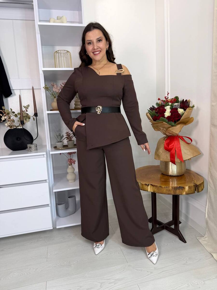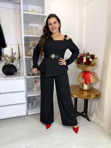 Нарядний костюм-двійка : блуза цікавого крою : одне оголене плече з прикрасою, V- образний виріз, низ кльош з розрізом , по спинці золота молнія, чорний пояс з прикрасою йде в комплекті.