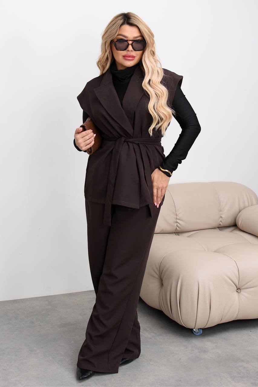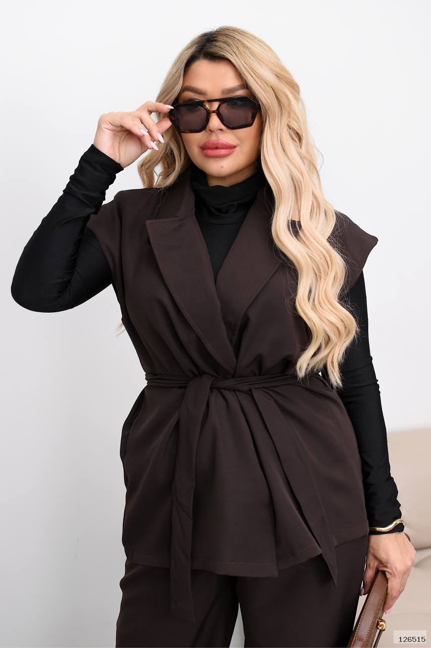 Елегантний костюм-двійка з костюмної тканини - вибір для жінок, які цінують комфорт та стиль. Прямі штани візуально витягають силует, а подовжений жилет з англійським коміром надає образу витонченості. Модель на запах із поясом акцентує талію, створюючи жіночний силует. Ідеальний як для ділових зустрічей, так і для стильних прогулянок містом.
