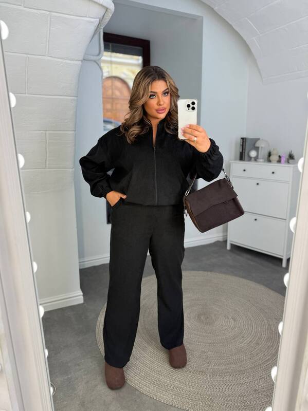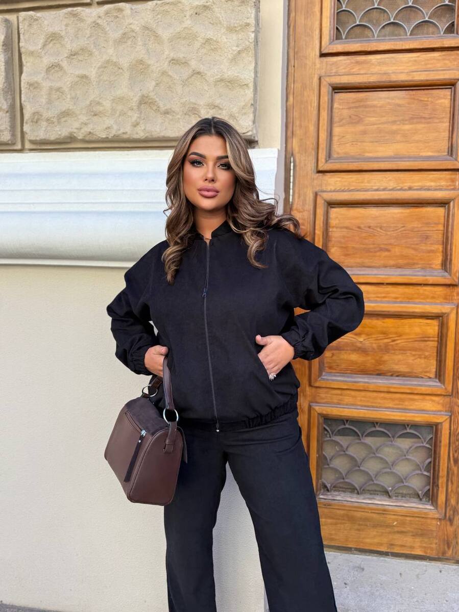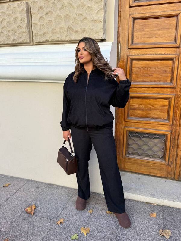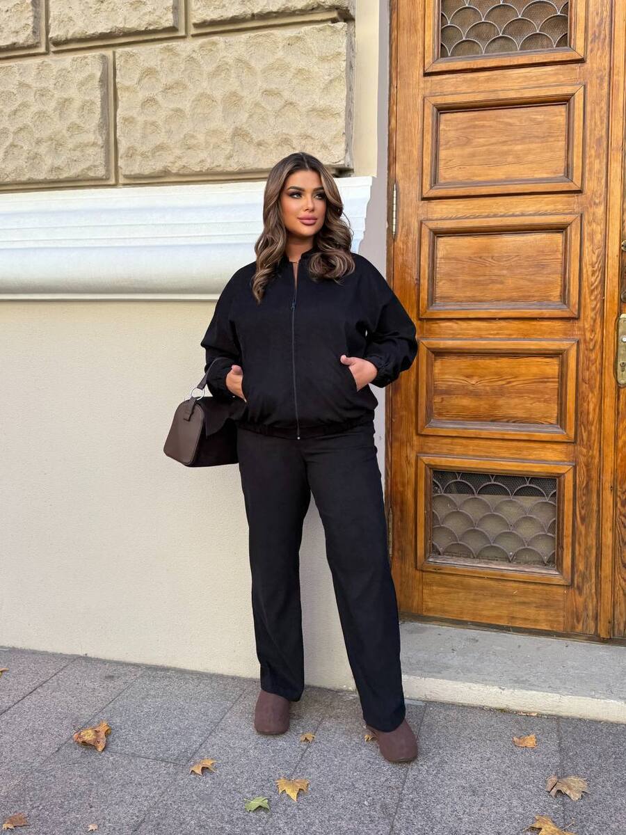Костюм вельвет бомбер + штани. Бомбер на блискавці, знизу на резинці, довгий спущений рукав на резинці, із кишенями. Штани прямого крою високої посадки, із кишенями,талія на резинці.