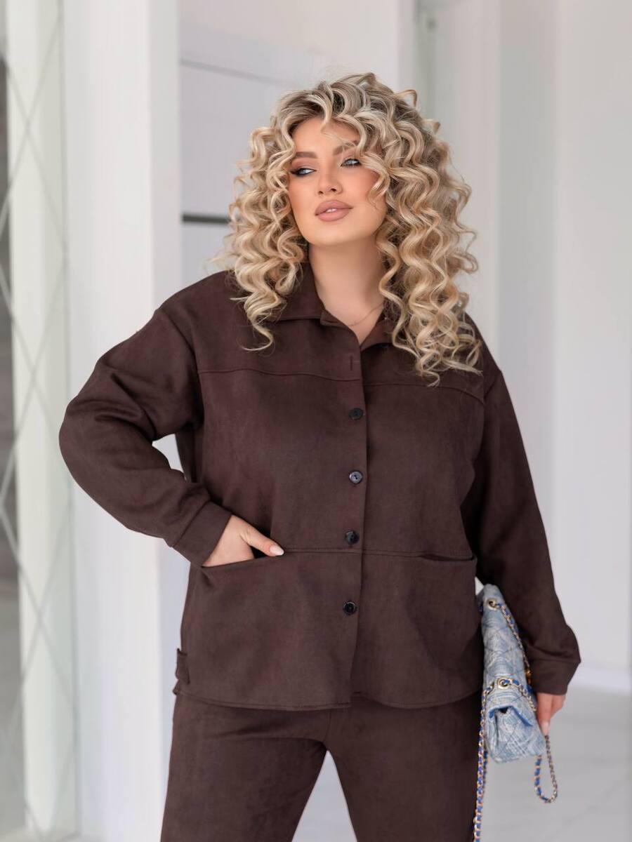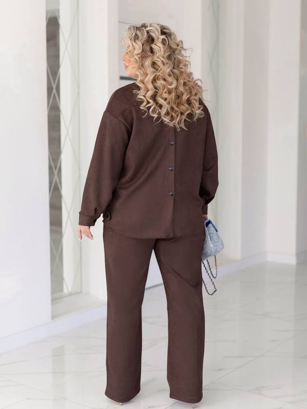 Стильний костюм двійка із замшу. На куртці позаду декор ґудзик. Штани прямі