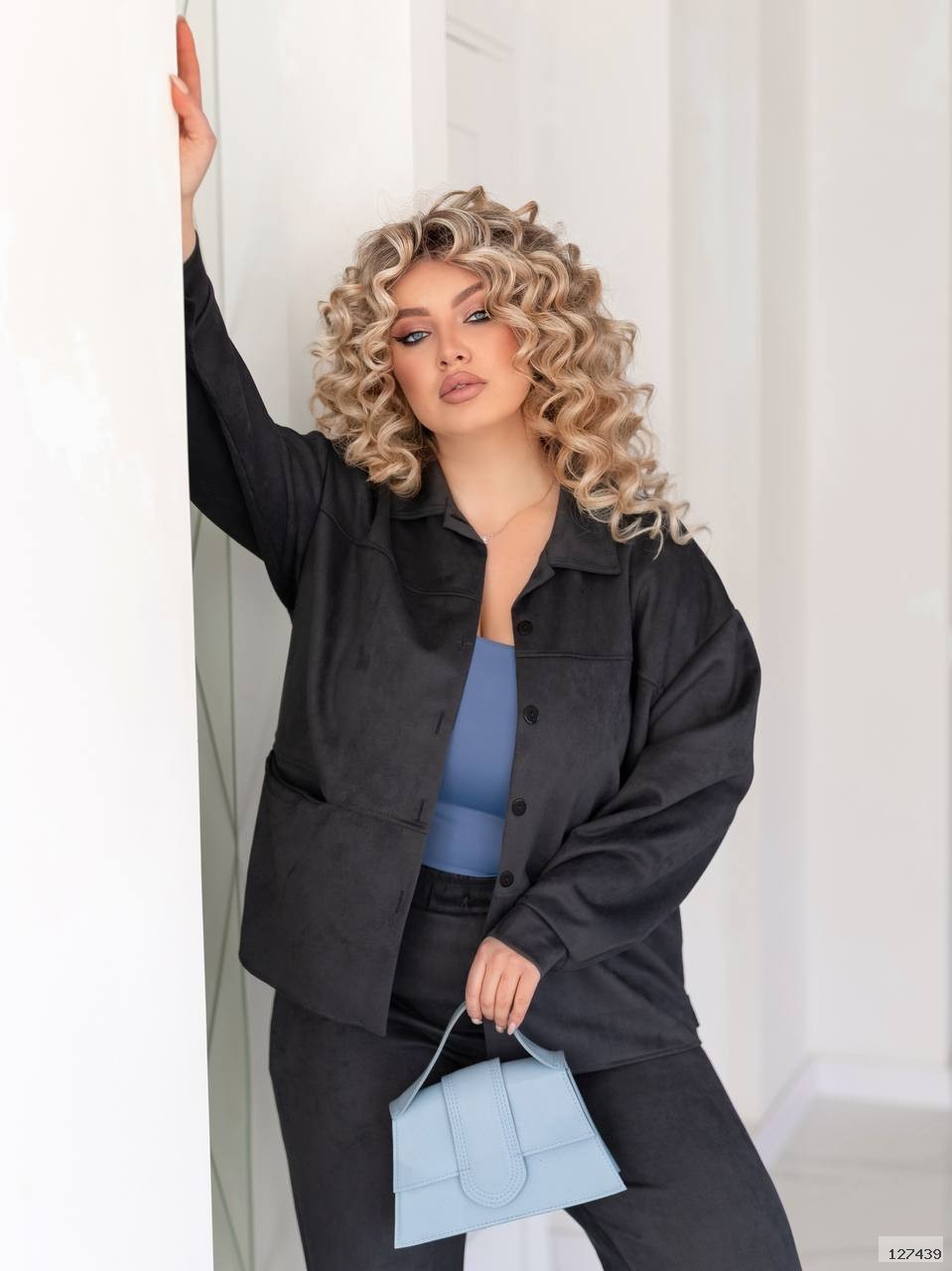 Стильний костюм двійка із замшу. На куртці позаду декор ґудзик. Штани прямі