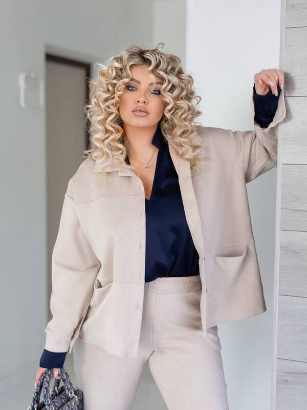 Стильний костюм двійка із замшу. На куртці позаду декор ґудзик. Штани прямі