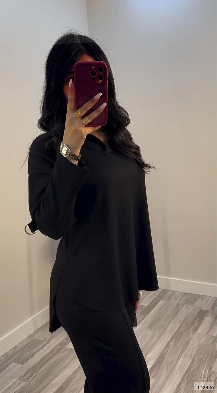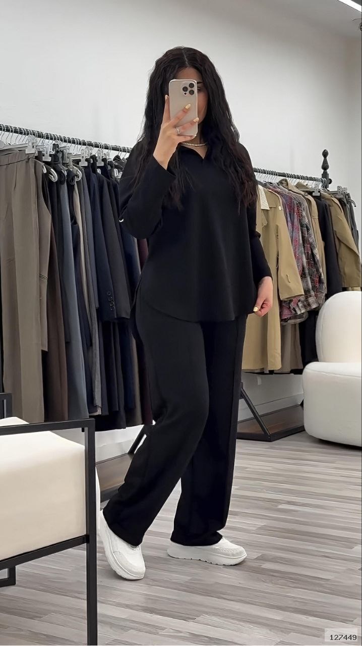 Штани на резинці, з високою посадкою. Універсальний дизайн — під кросівки, лофери чи підбори. Рукава в сорочці регулюються патами, що дає можливість легко перетворити рукав повної довжини на рукав 3/4. Приємна до тіла тканина, має розтяжність.