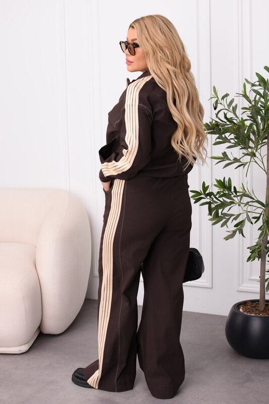 Стильний брючний костюм з еластичної тканини для тих, хто любить баланс комфорту й елегантності. Кофта та штани оздоблені лампасами: кофта на блискавці по всій довжині з прорізними кишенями та еластичним манжетом внизу. Штани середньої посадки з еластичною резинкою на поясі у стилі палаццо — витягують силует і пасують до будь-якого взуття, від кросівок до лоферів.