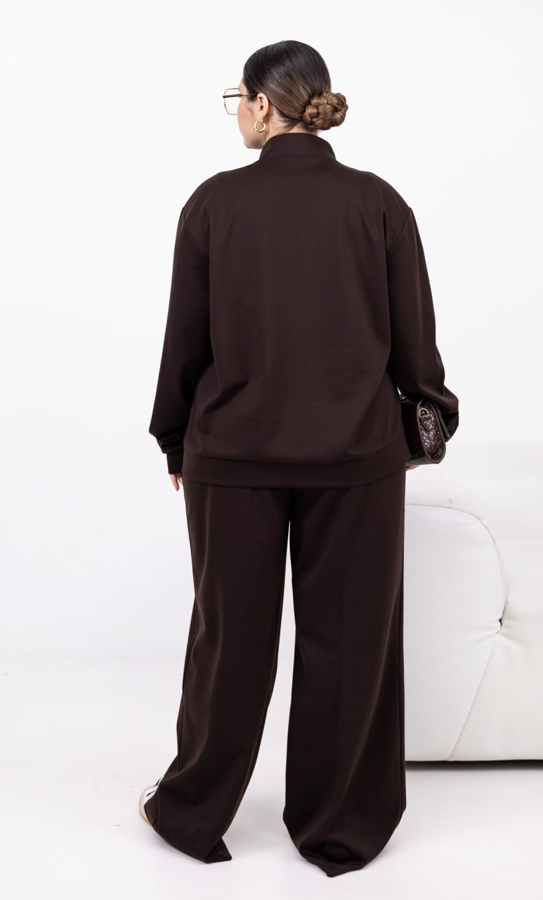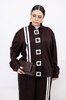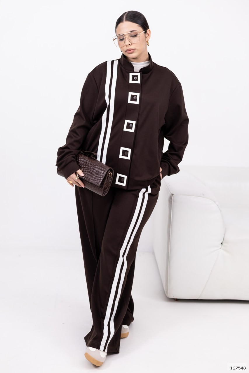 Стильний брючний костюм з еластичної тканини для тих, хто цінує баланс комфорту й елегантності. Лампаси додають динаміки, а геометричний декор (квадрат) на кофті — стильний акцент. Кофта на ґудзиках по всій довжині з прорізними кишенями. Вільні штани середньої посадки з еластичною резинкою на поясі — зручні на щодень і для поїздок.