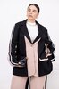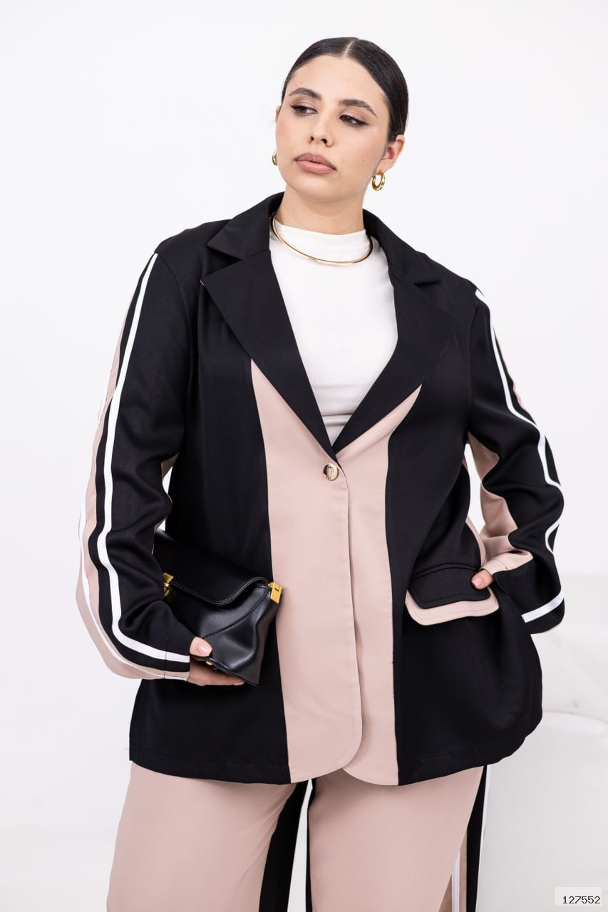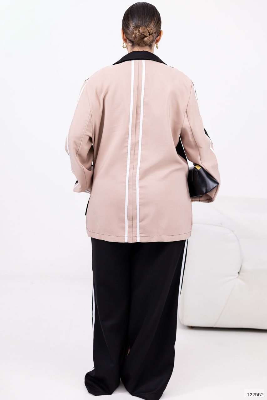 Стильний брючний костюм із костюмної тканини. Комбіновані кольори, лампаси та легкий оверсайз роблять образ сучасним і виразним. Ідеальний для міських прогулянок, подорожей і смарт-кежуал виходів. Піджак застібається на кнопку з прорізними кишенями-клапанами; вільні штани середньої посадки з еластичною резинкою на поясі — комфорт щодня без компромісів.