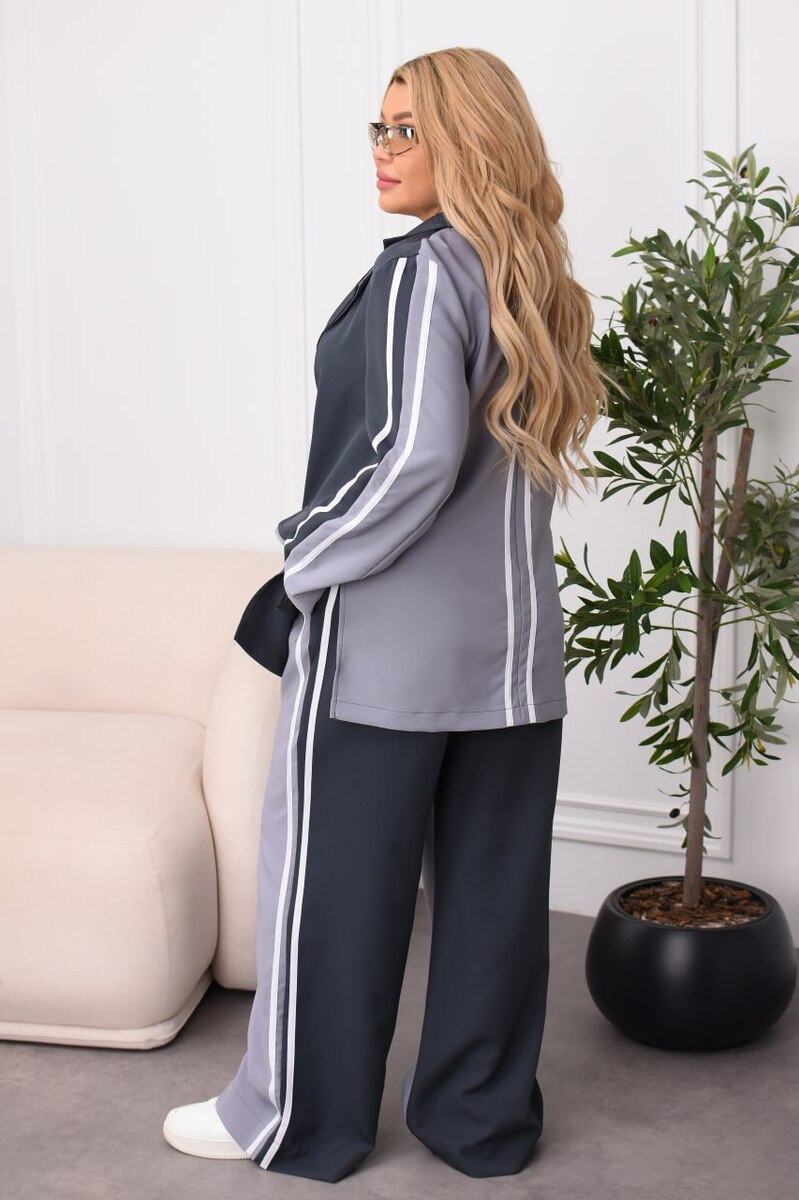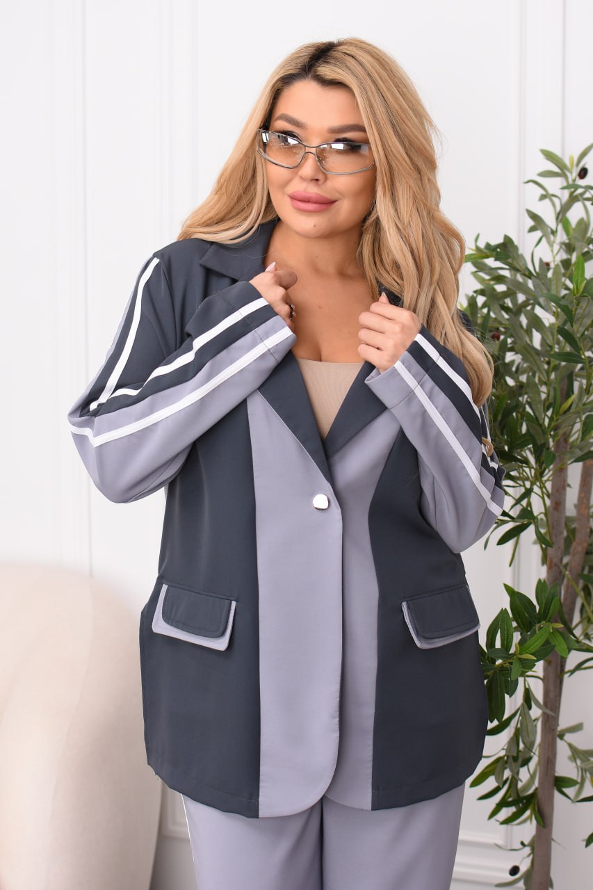 Стильний брючний костюм із костюмної тканини. Комбіновані кольори, лампаси та легкий оверсайз роблять образ сучасним і виразним. Ідеальний для міських прогулянок, подорожей і смарт-кежуал виходів. Піджак застібається на кнопку з прорізними кишенями-клапанами; вільні штани середньої посадки з еластичною резинкою на поясі — комфорт щодня без компромісів.