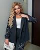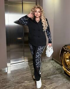 Костюм-двійка цікавого крою : на рукавах та штанках принтовані вставки + пришивний лампас. Жакет застібається на два ряди ґудзиків , на рукавах манжети з ґудзиками . Штани на резинці , з боків кишені .