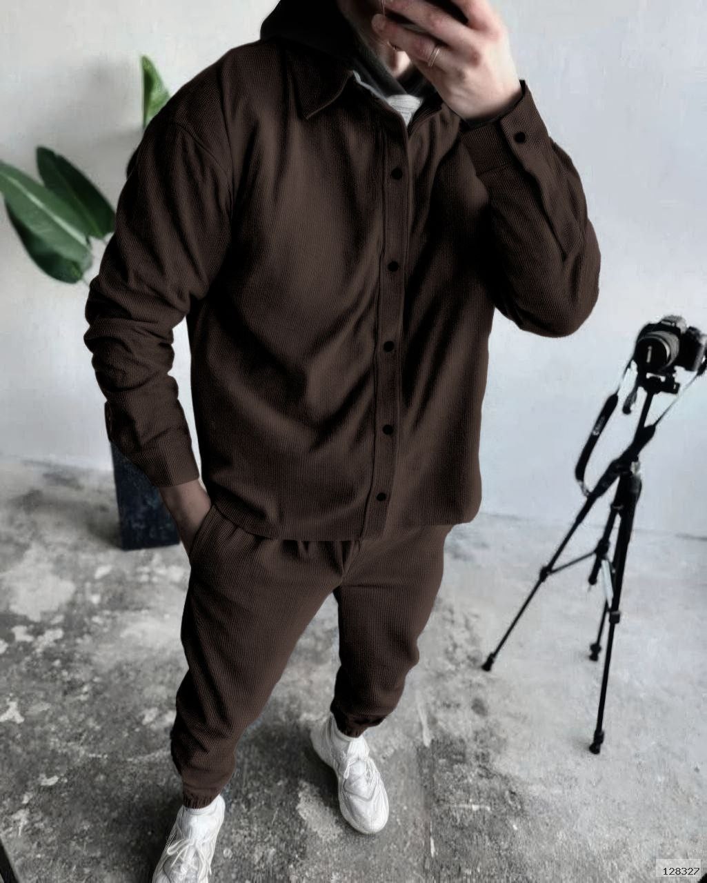 Сорочка на кнопках доповнюється стильними штанами з поясом на резинці та шнурком для ідеальної посадки,бічними кишенями та манжетами-резинками знизу.
