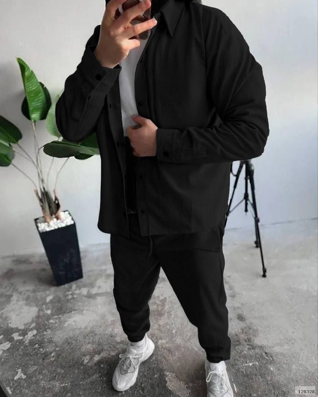 Сорочка на кнопках доповнюється стильними штанами з поясом на резинці та шнурком для ідеальної посадки,бічними кишенями та манжетами-резинками знизу.
