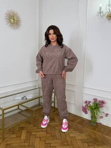 Костюм кофта вільного крою, низ на резинці з фіксаторами, рукав манжет на резинці. Штани талія на резинці з фіксатором, низ штанів на резинці, з двома кишенями.