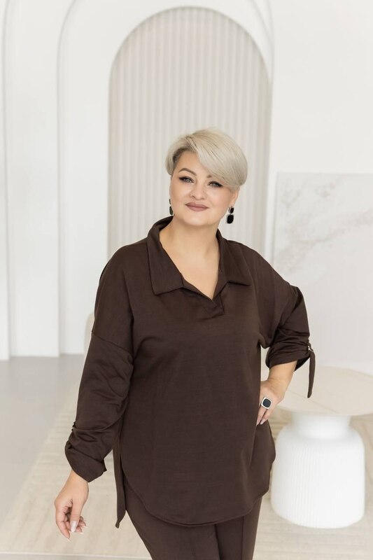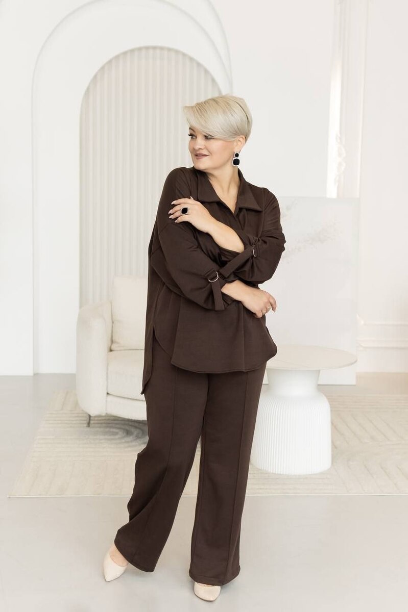 Стильний костюм на щодень. Вільна сорочка з V-вирізом та прямі брюки візуально витягують силует.