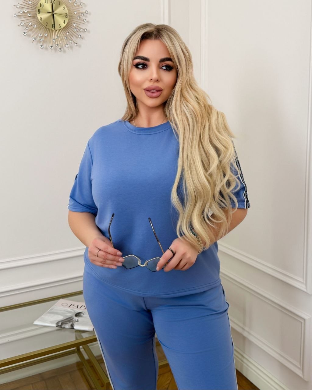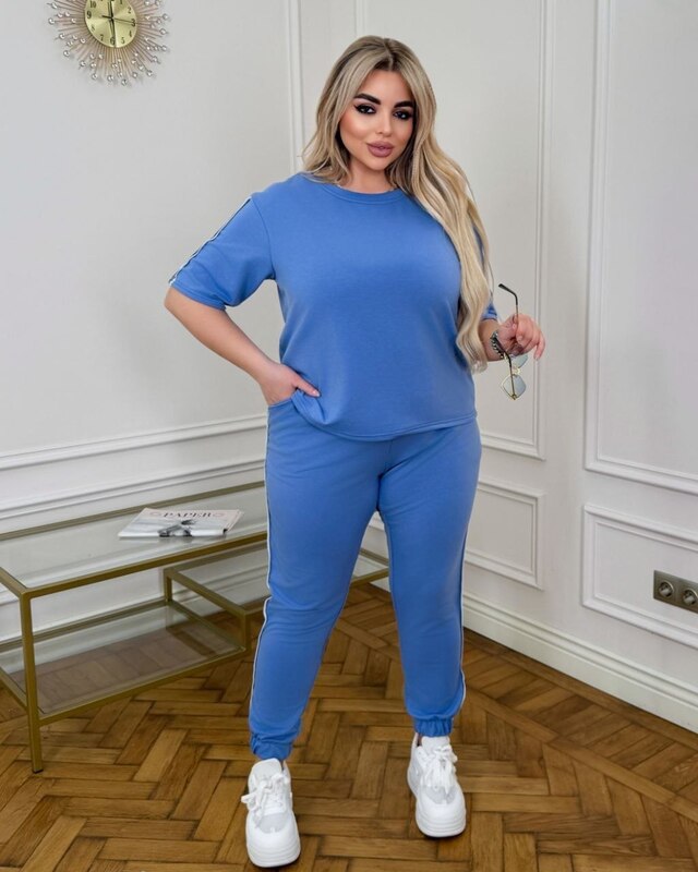 Весняно-літній костюм, футболка + штани, футболка з коротким рукавом і лампасами по рукавах. Штани джогери з кишенями на гумці, в поясі є шнурок, внизу манжета, лампаси з боків.