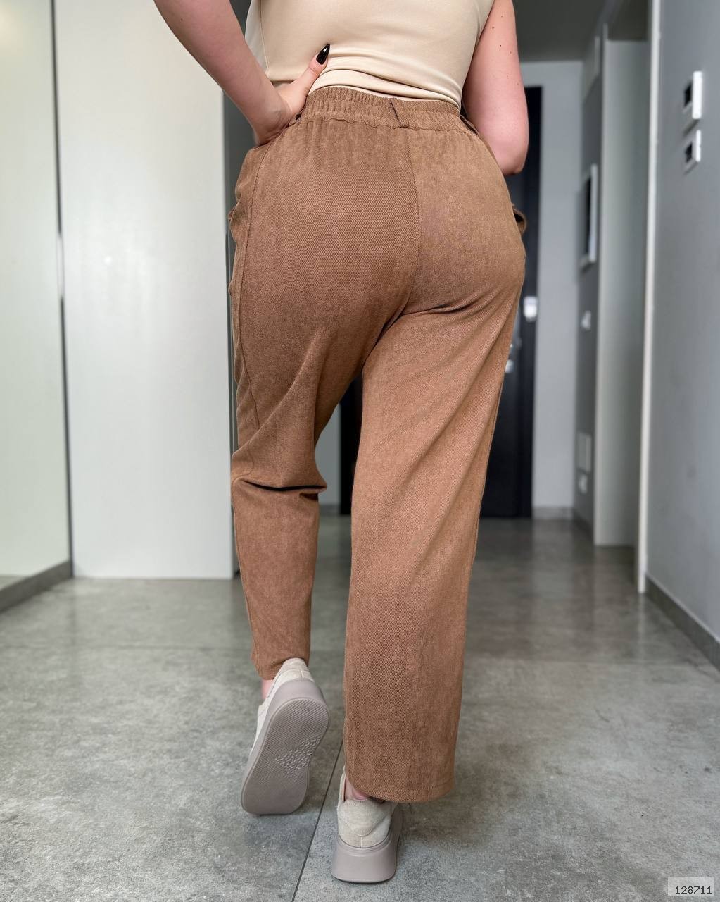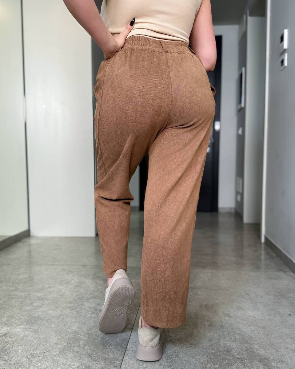 Брюки високої посадки, звужені до низу. втачний пояс з частково на гумці. Застібка на блискавці. В бокових швах косі кишені.