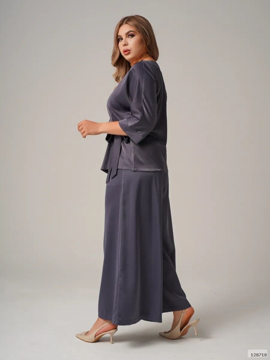 Комфортний, універсальний і дуже ефектний костюм, як для повсякденного образу, так і для особливих подій. Блуза з асиметричною зав’язкою формує красивий силует, а широкі брюки створюють ефект витягнутої фігури, пояс на резинці.Тканина м’яко лягає по фігурі, виглядає дорого та комфортна у носінні.
