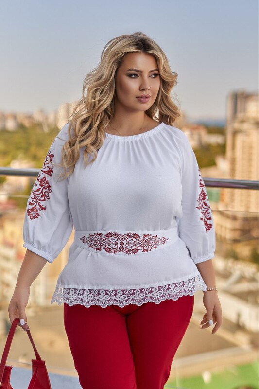 Блузка з легкої тканини штапель, прикрашена орнаментом-аплікацією на рукавах та по лінії талії на поясі. пояс знімається.