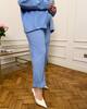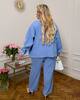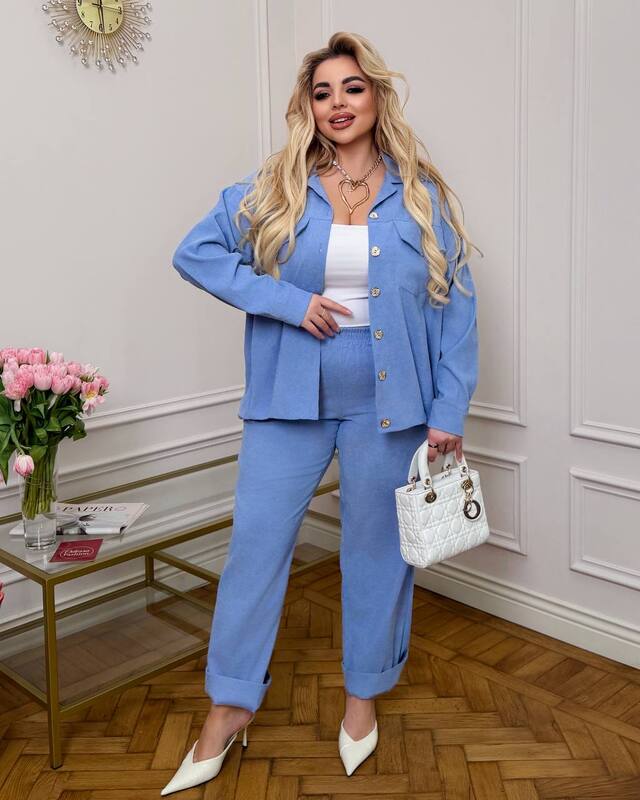 Костюм складається з сорочки-жакета на ґудзиках та зручних штанів із високою посадкою.
