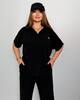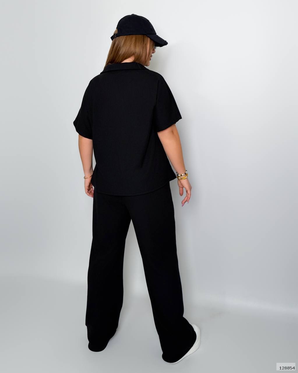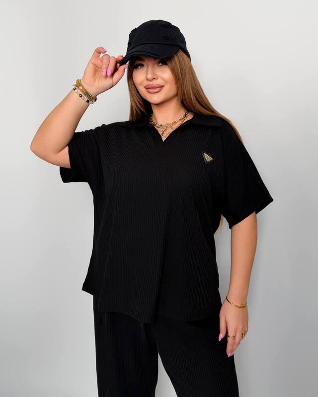 Стильний комфортний костюм “Barcelona” з трикотажу рубчик хб стрейч: футболка у стилі поло оверсайз з Акс + штани прямі розширені з високою посадкою з кішенями у бічних швах, з куліскою на поясі