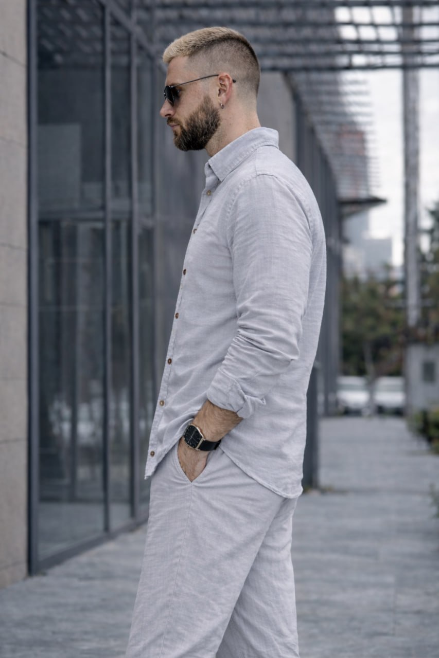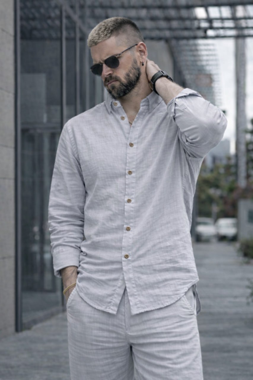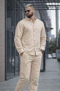 Стильний чоловічий костюм — ідеальний варіант для літа. Комплект складається з легкої сорочки та зручних брюк. Виконаний із натуральної тканини льон бохо, що добре пропускає повітря та забезпечує комфорт навіть у спеку. Сорочка з довгим рукавом, на ґудзиках, має сучасний мінімалістичний крій. Брюки прямого крою з комфортною посадкою та еластичним поясом.