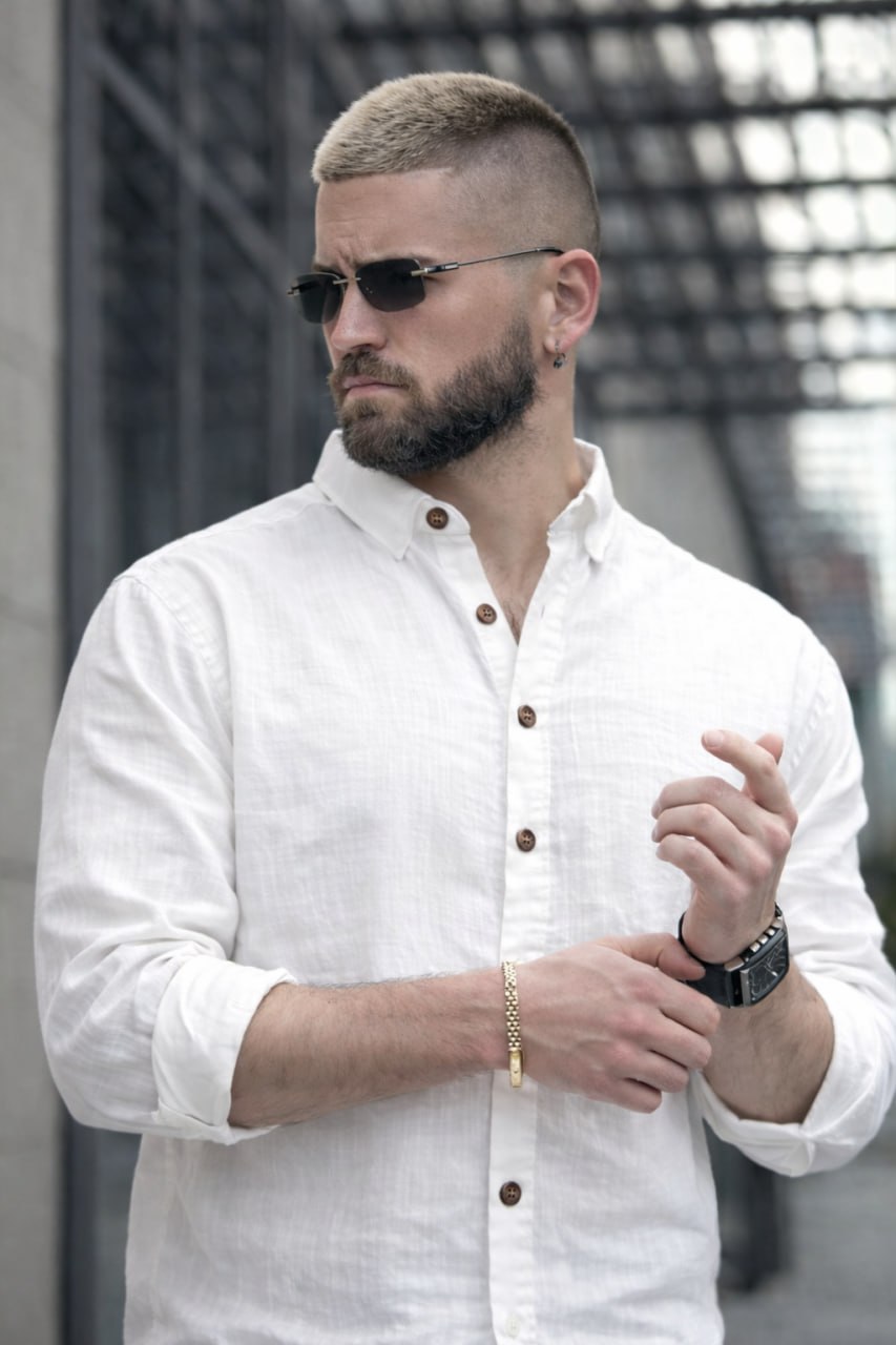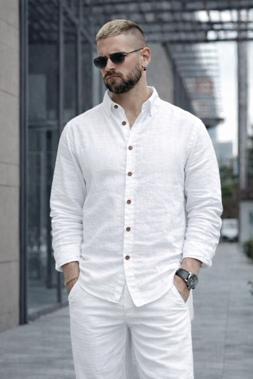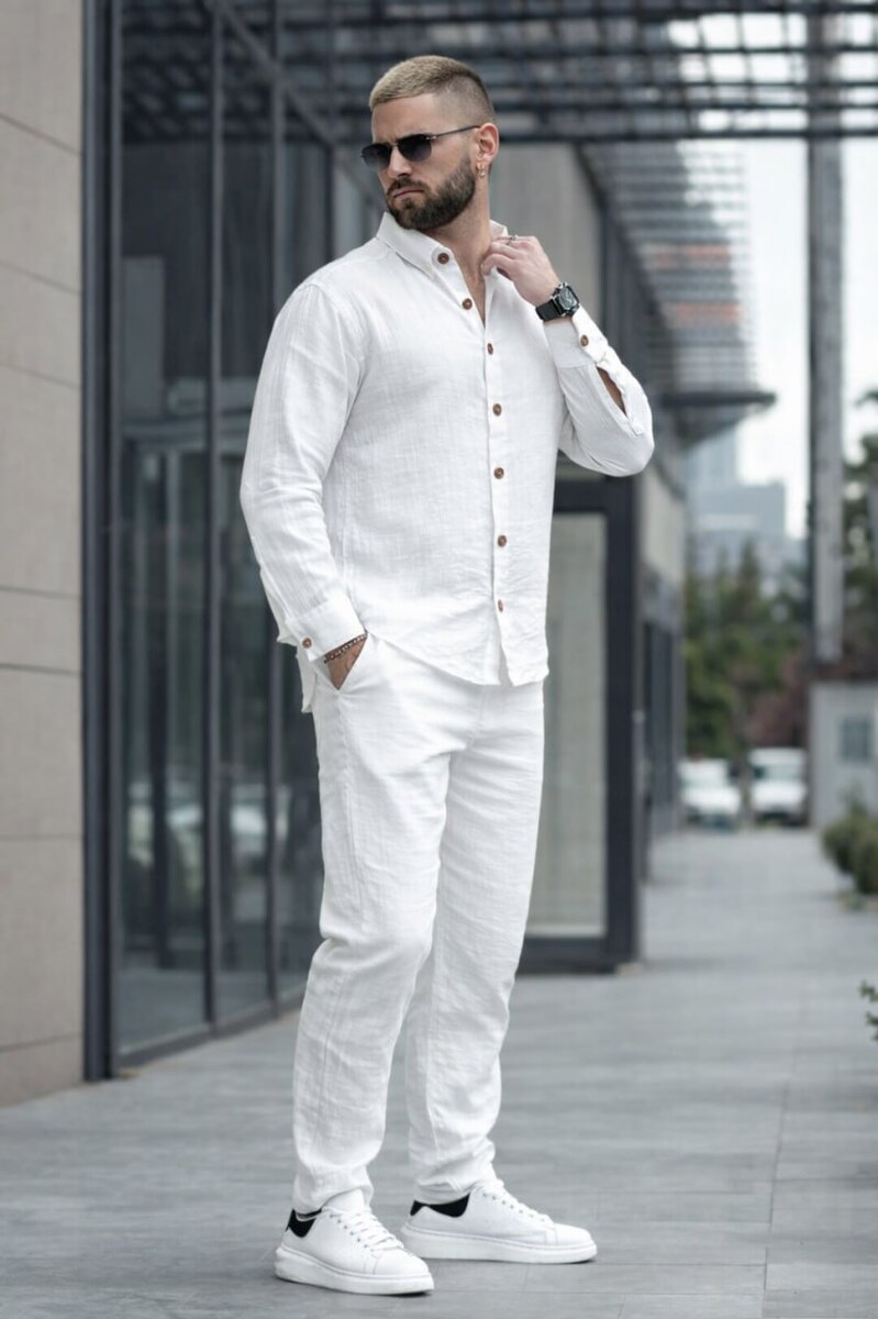 Стильний чоловічий костюм — ідеальний варіант для літа. Комплект складається з легкої сорочки та зручних брюк. Виконаний із натуральної тканини льон бохо, що добре пропускає повітря та забезпечує комфорт навіть у спеку. Сорочка з довгим рукавом, на ґудзиках, має сучасний мінімалістичний крій. Брюки прямого крою з комфортною посадкою та еластичним поясом.