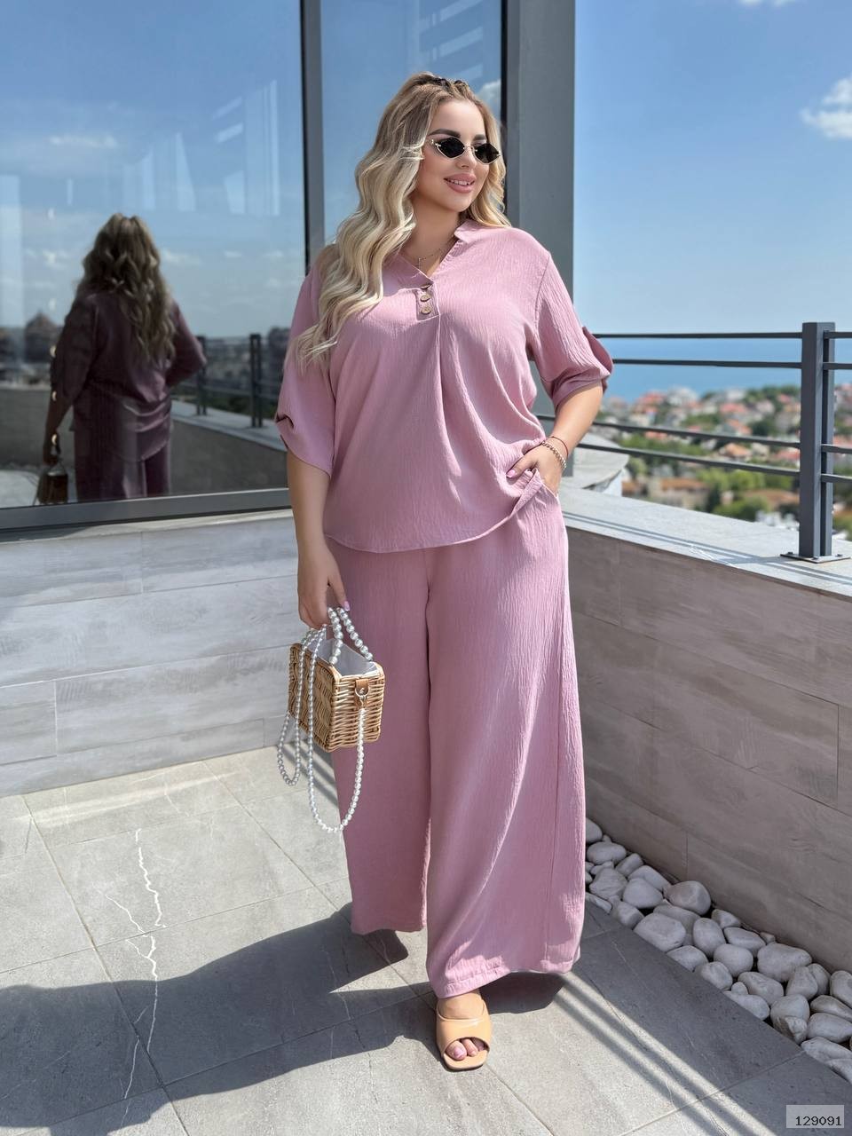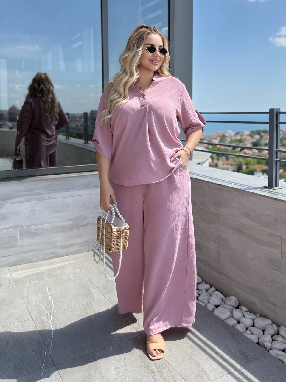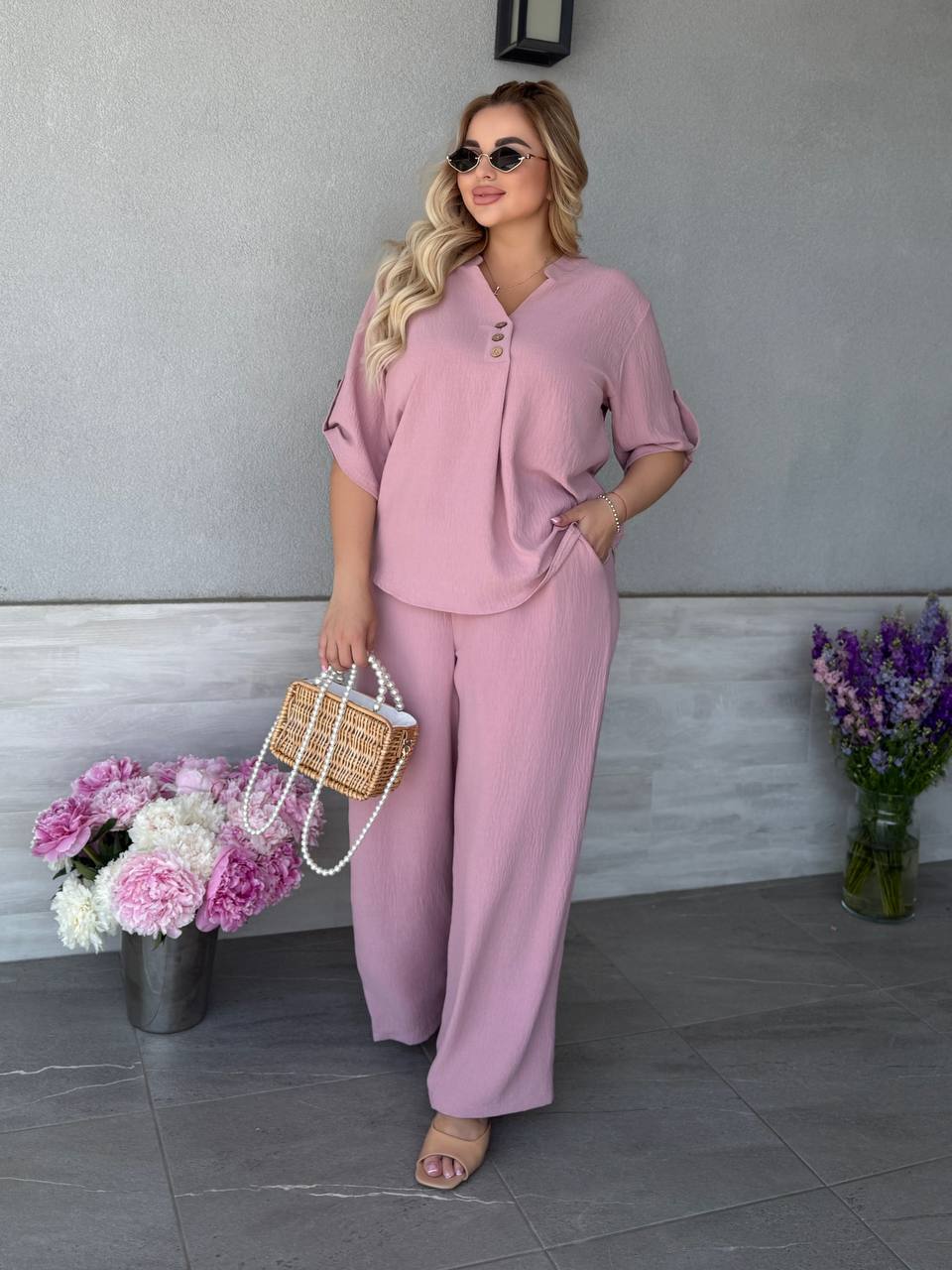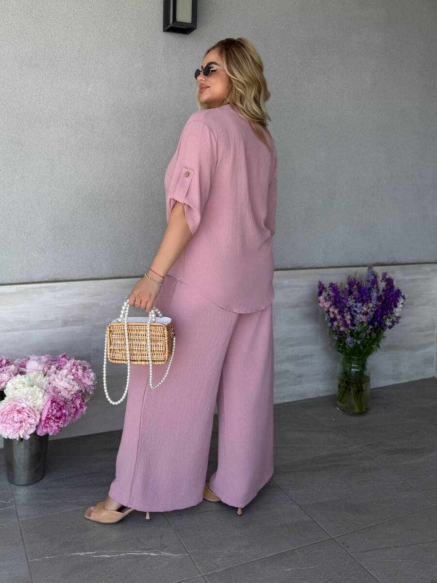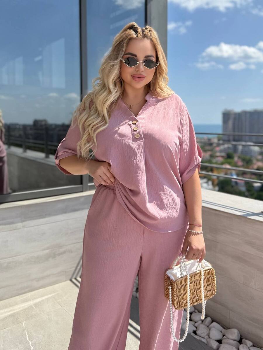 Штани палаццо вільного крою мають бічні кишені та резинку на талії, футболка вільного крою декорована ґудзиками, довжина рукава регулюється