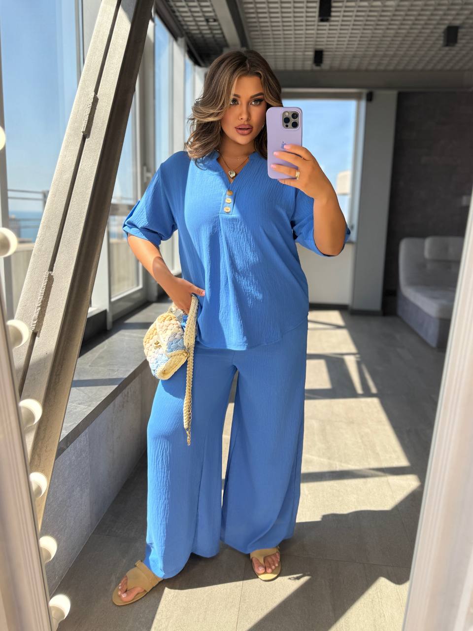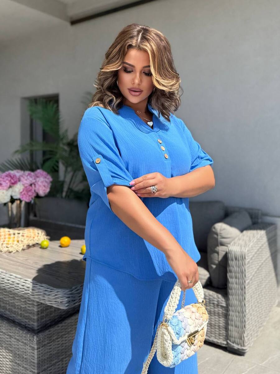 Штани палаццо вільного крою мають бічні кишені та резинку на талії, футболка вільного крою декорована ґудзиками, довжина рукава регулюється